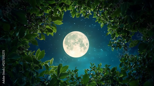 Fototapeta premium Enchanted Moonlight Night: A Full Moon's Serene Glow Through Lush Foliage