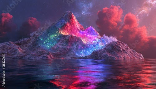 © Mana, Fototapeta premium Enchanted Mountain Landscape with Colorful Nebula and Reflections