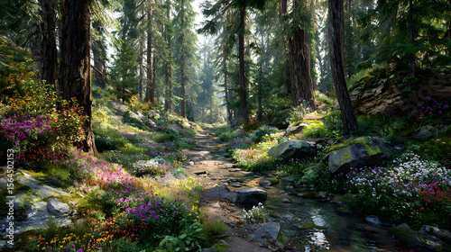 Obraz premium Enchanted Mountain Trail: A Serene Journey through Lush Forests and Crystal Streams