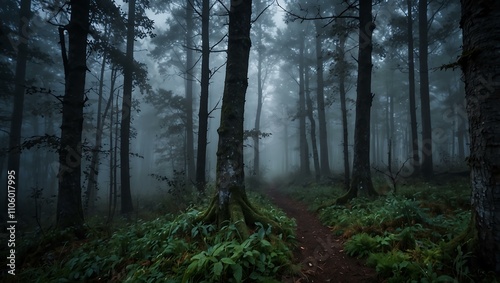 Obraz premium Enchanted, mystical foggy twilight scene in the forest.