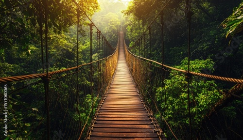 © Ranez, Fototapeta premium Enchanted Nature Trail with Hanging Wooden Bridge