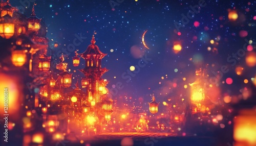 © Riz, Fototapeta premium Enchanted Night Cityscape with Glowing Lanterns and Starry Sky