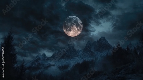 Naklejka premium Enchanted Night Sky with Full Moon Over Mountains