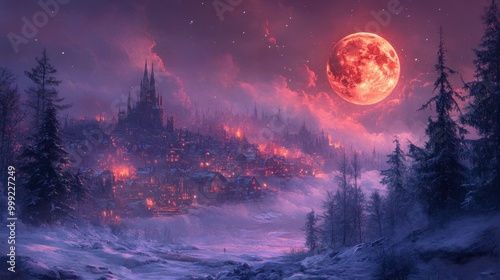 Naklejka premium Enchanted Night: Werewolves Howling at Pizza Moon in Festive Town