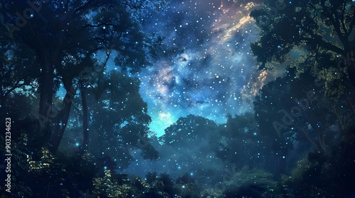 Fototapeta premium Enchanted nighttime forest landscape with celestial elements