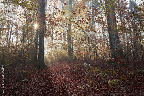 Obraz premium Enchanted path with light in forest during autumn