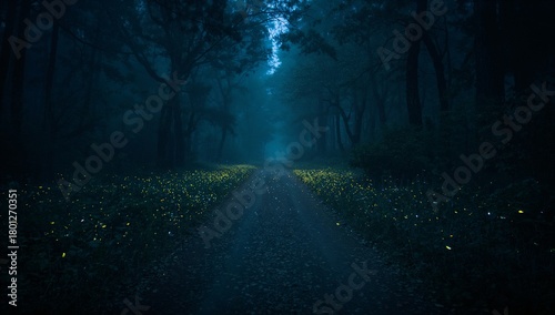 © Kanika Graphic, Fototapeta premium Enchanted Pathway Through a Dark Forest with Glowing Fireflies at Night