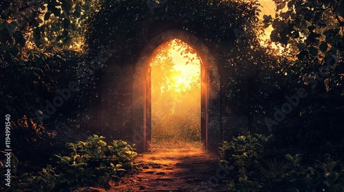 Fototapeta premium Enchanted Pathway Through Lush Greenery Towards Glowing Sunset
