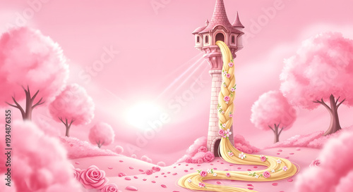 Obraz premium Enchanted Pink Castle Tower with Cherry Blossoms