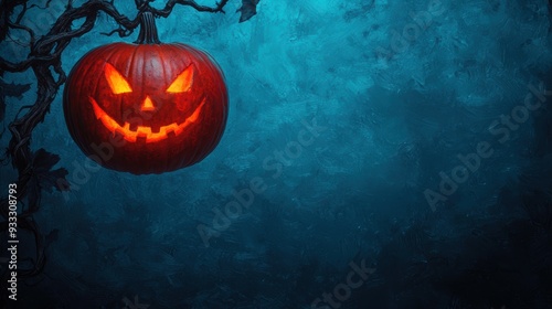 Naklejka premium Enchanted Pumpkin Hanging from Twisted Vine in Haunted Orchard with Magical Glow - Halloween Fantasy Concept