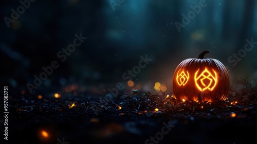 Naklejka premium Enchanted Pumpkin with Glowing Runes Emitting Magical Aura in Darkness - Selective Focus Ultra HD