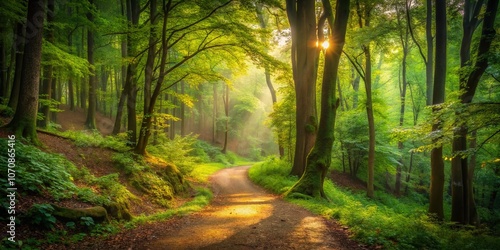 © Adisorn, Fototapeta premium Enchanted Small Path in a Lush Forest During Late Summer with Soft, Diffused Light Creating a Mystical Atmosphere for Nature Lovers and Enthusiasts