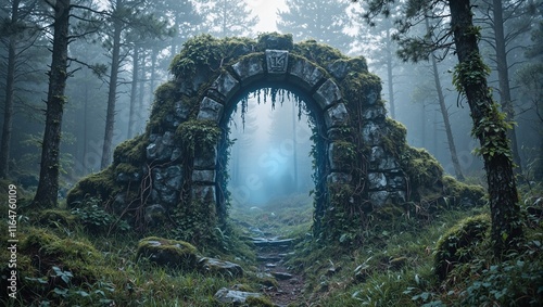 Obraz premium Enchanted stone portal with vines moss and blue glow in misty forest clearing at dawn