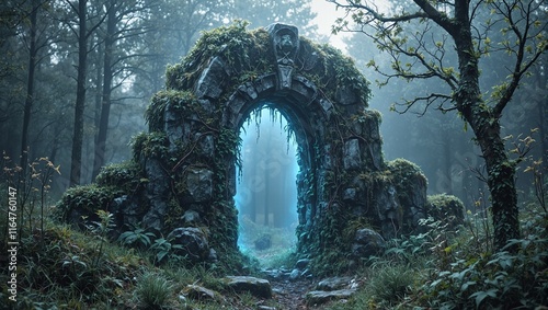 Obraz premium Enchanted stone portal with vines moss and blue glow in misty forest clearing at dawn
