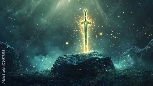 Naklejka premium Enchanted Sword Embedded in Stone with Mystical Glow Under Ethereal Light,...