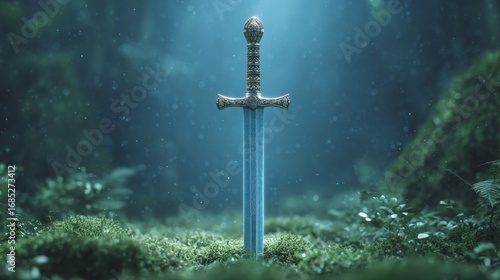 © 69, Naklejka premium Enchanted Sword Stabbing Firmly into Lush Green Forest Ground in Mystical Environment with Soft Atmospheric Light and Gentle Mist Surrounding It