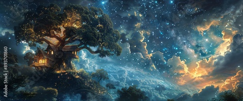 © Level UP, Fototapeta premium Enchanted Tree House in Tranquil Forest with Stunning Galaxy Sky A Magical Retreat Under the Stars