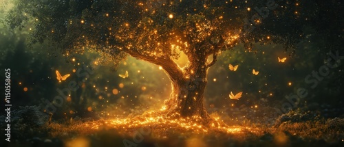 Naklejka premium Enchanted tree surrounded by glowing fireflies and butterflies in a mystical...