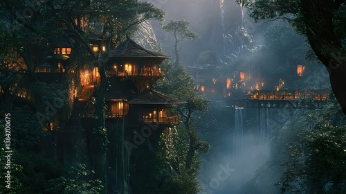 Fototapeta premium Enchanted Treehouse Resort: A Dream Vacation in Lush Jungle