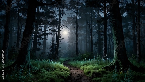 © claudunia, Fototapeta premium Enchanted twilight forest in moonlit serenity.