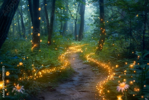 Fototapeta premium Enchanted Twinkling Fireflies Lighting Up a Magical Forest Path at Dusk