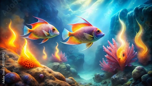 Naklejka premium Enchanted Underwater Realm Two Vibrant Fish Swim Amidst Luminescent Coral and Ethereal Flames in a Mystical Ocean Depths Scene