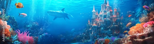 Naklejka premium Enchanted underwater scene with a majestic castle, vibrant coral reef, playful fish, and a graceful shark. Perfect for fantasy, fairytale, and marine themes.