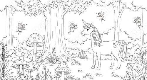 © Helal, Fototapeta premium Enchanted Unicorn in a Magical Forest A Coloring Page