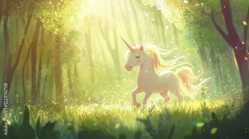 © Kitta Studio, Fototapeta premium Enchanted Unicorn Wandering Through a Mystical Forest Clearing