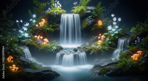 Obraz premium Enchanted Waterfall: A Serene Night in a Mystical Garden
