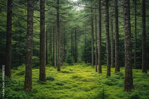Obraz premium Enchanted Wilderness: Exploring the Majestic Tall Green Trees of a Thick Forest