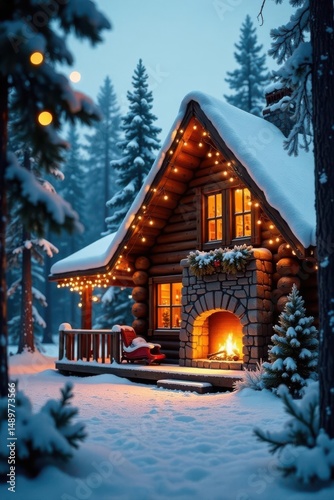 Fototapeta premium Enchanted Winter Cabin Festive Lights Adorn Snow-Covered Log Home with Cozy Fireplace