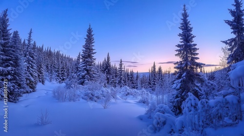 Fototapeta premium enchanted winter forest at dusk with crystalline snow-covered evergreens,...