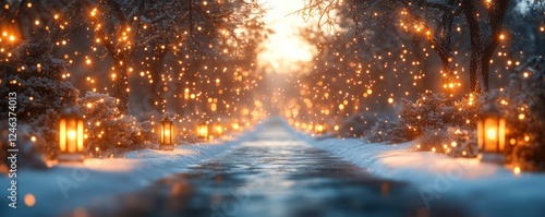 Fototapeta premium Enchanted Winter Pathway: A Magical Snow-Covered Walkway Lit by Warm Lanterns and Fairy Lights