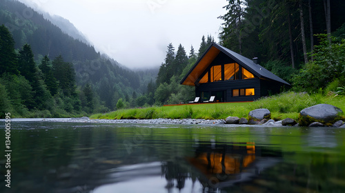 © PPS, Fototapeta premium Enchanted Wooden House by a River in a Fantasy Forest