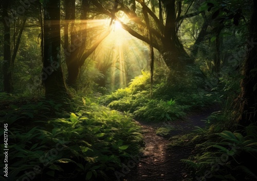 Obraz premium "Enchanted Woods: Streaming Sunlight". Digital poster. Generative AI.