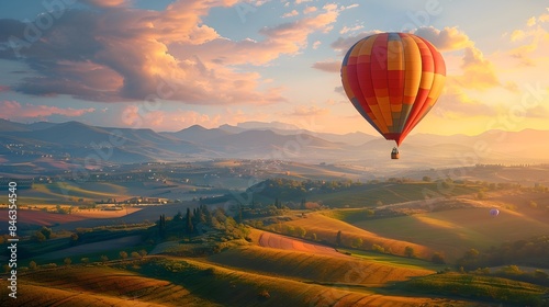 Fototapeta premium Enchanting Aerial Voyage Over Picturesque Countryside with Vibrant Hot Air...
