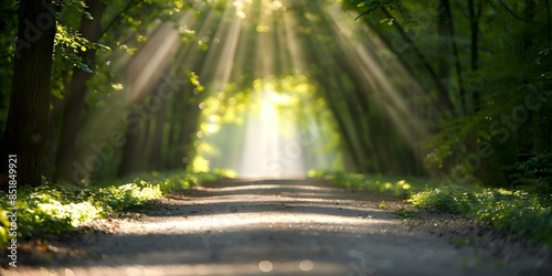 © Anastasiia, Fototapeta premium Enchanting Ambiance Sunlit Forest Path. Concept Enchanting Ambiance, Sunlit Forest Path
