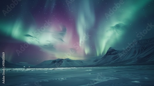 Naklejka premium Enchanting Aurora Borealis Vibrant Colors Dance in Snowy Night Sky Magical...