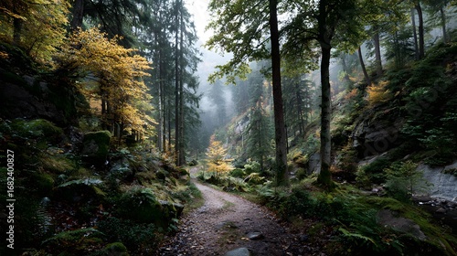 © Wildan, Fototapeta premium Enchanting Autumn Forest Path Bathed in Soft, Misty Sunlight
