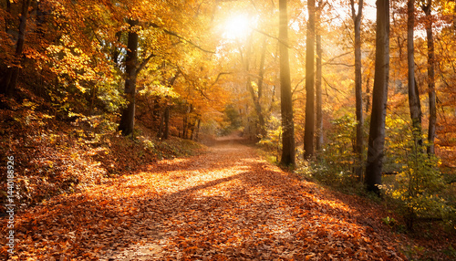 Obraz premium enchanting autumn forest path with falling leaves and warm light