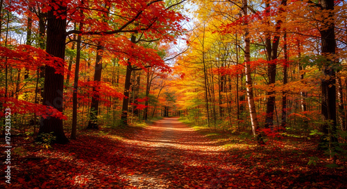 © ISMILE, Obraz premium Enchanting Autumn Forest Path with Golden and Red Leaves.