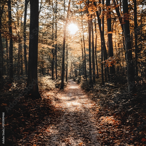 © ImageHive, Obraz premium Enchanting Autumn Forest Path with Vibrant Foliage