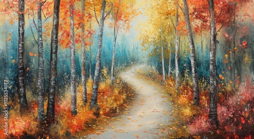 © Mokhtar, Obraz premium Enchanting autumn forest path with vibrant leaves and serene atmosphere.