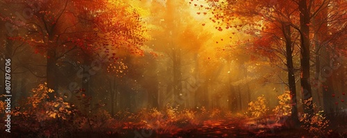 Naklejka premium Enchanting Autumn Forest Scene with Falling Leaves