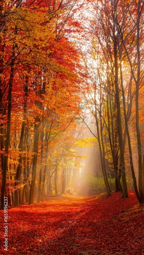 © Mithila Farzana, Fototapeta premium Enchanting Autumn Forest with Sunbeams and Red Leaves