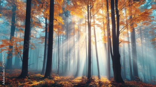 Obraz premium Enchanting Autumn Forest with Sunlight Filtering Through Trees and Fog