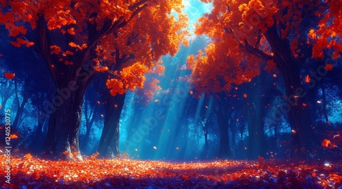© BonzEarthsnapper, Naklejka premium Enchanting Autumn Forest with Vibrant Orange Leaves and Soft Sunlight Filtering Through Trees in a Mystical Blue Atmosphere