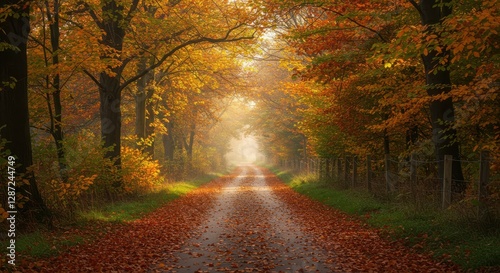 © IbragimovN, Obraz premium Enchanting autumn pathway lined with vibrant foliage and sunlit trees