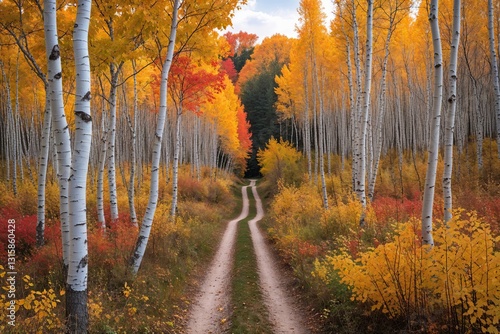 © Michael, Fototapeta premium Enchanting Autumn Pathway of Colorful Aspens and Birches in Nature